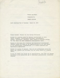 Presented in 1971 at New York University, Coumbite is a montage of songs and skits all denouncing the dictatorship in Haiti. Staged by Hervé Denis assisted by Jacky Charlier.